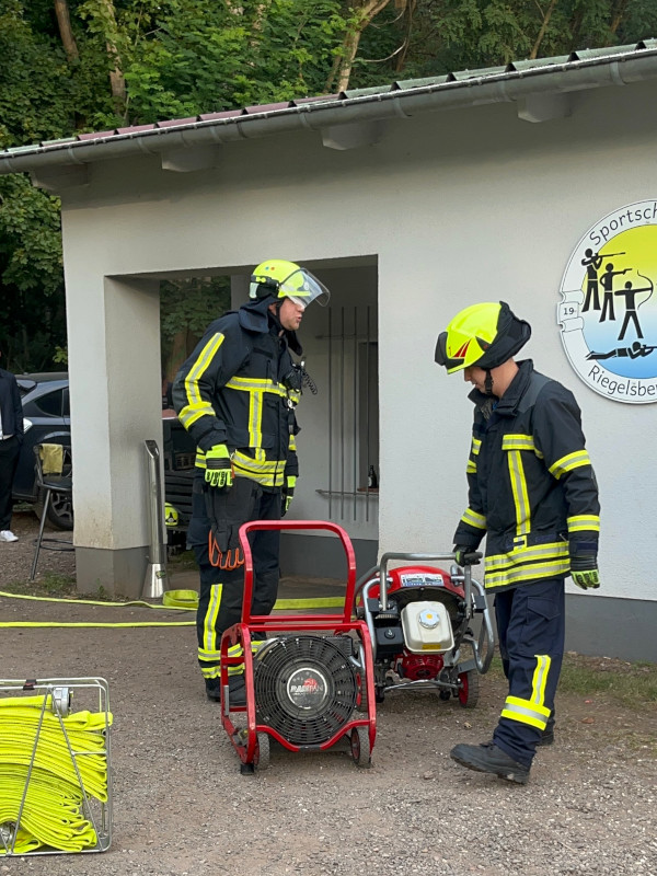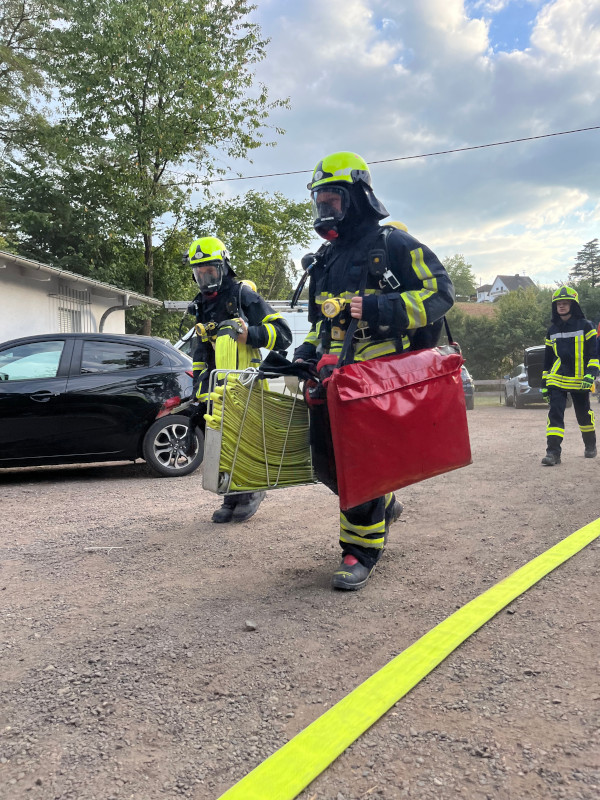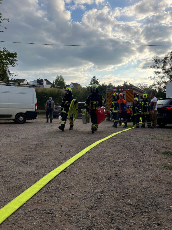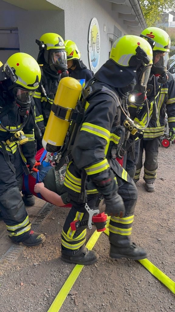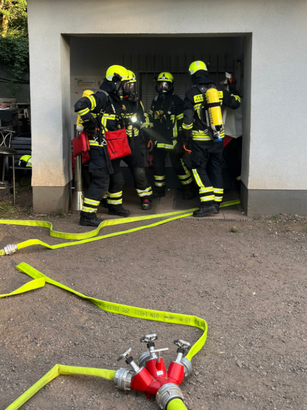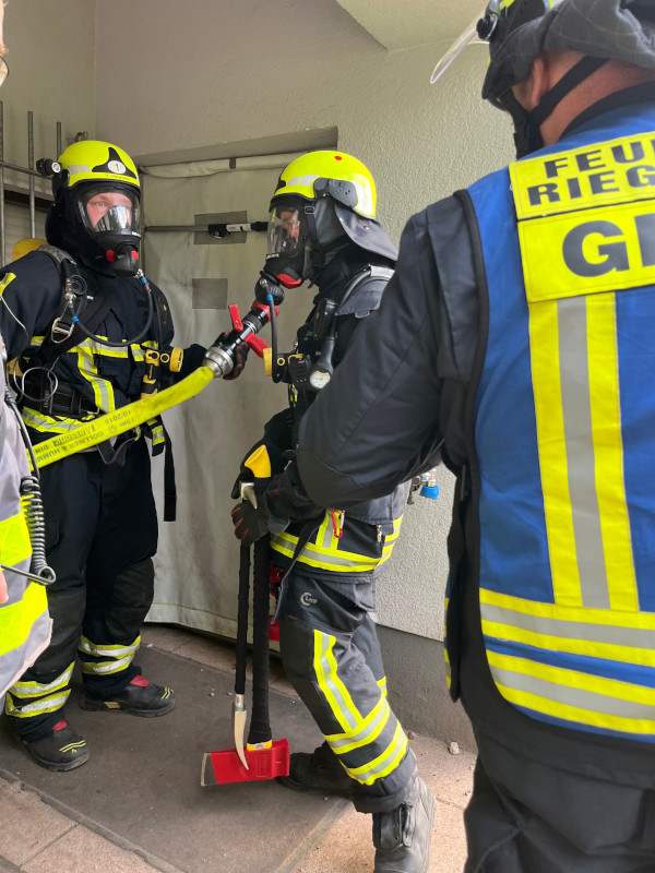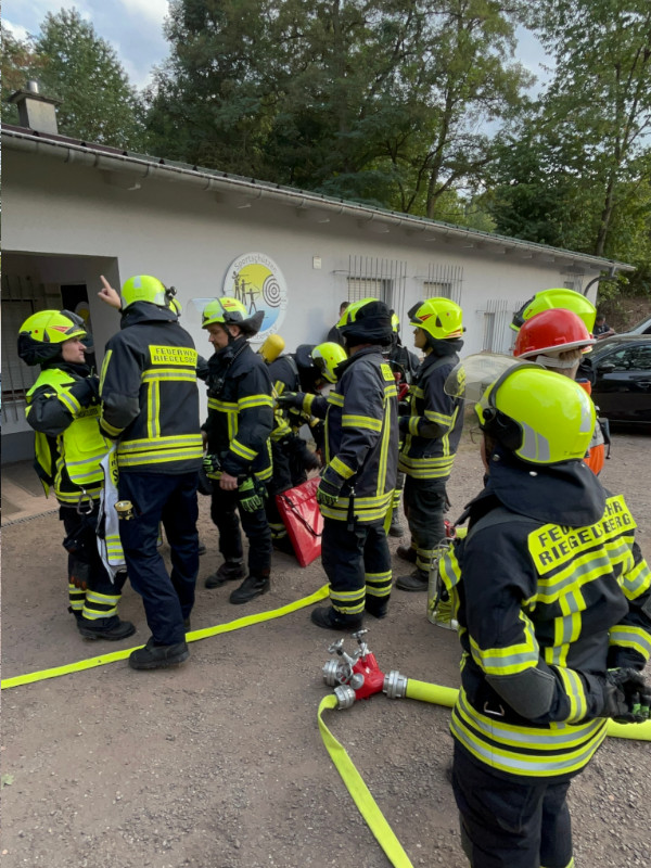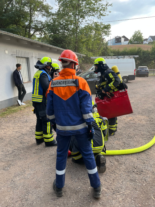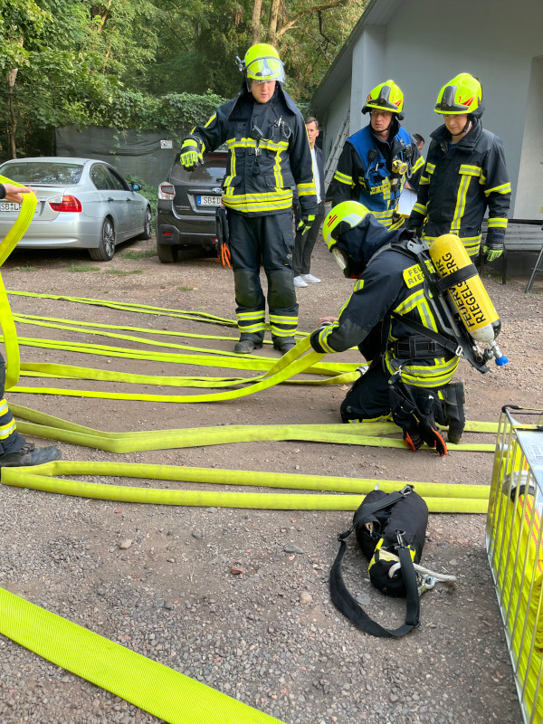 Von einem aufgeregten Vereinsmitglied wird der Einsatztrupp der Feuerwehr empfangen, es würden drei Menschen vermisst, die sich noch im Innern des Gebäudes befinden. Das Gebäudeinnere ist komplett verraucht, man sieht die Hand vor Augen nicht. Mit Masken und in voller Montur betreten die Feuerwehrleute das Vereinsheim und können nach kurzer Zeit die vermissten Menschen ins Freie retten und erste Hilfe leisten.