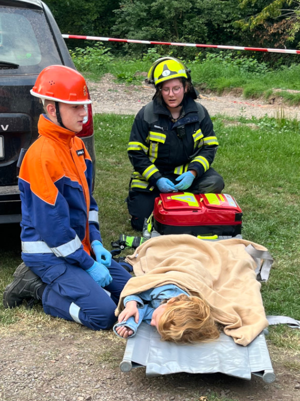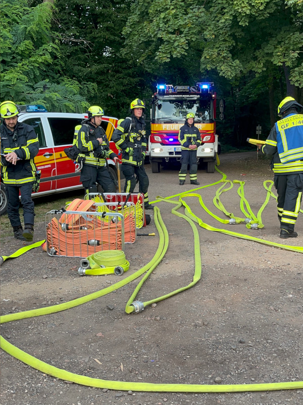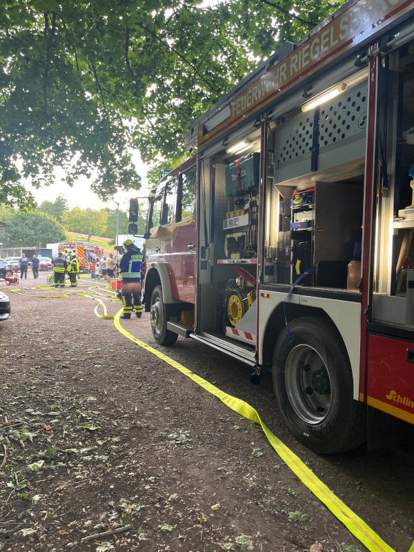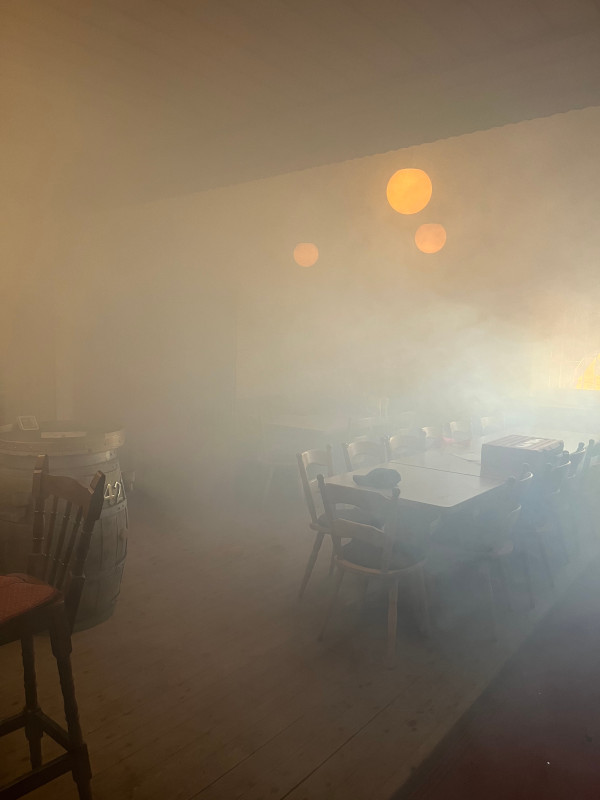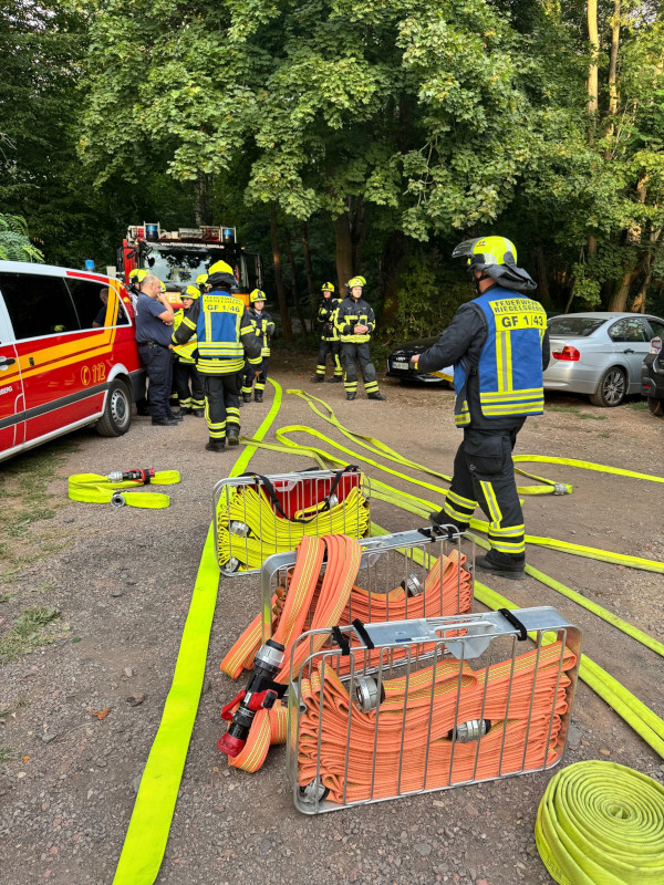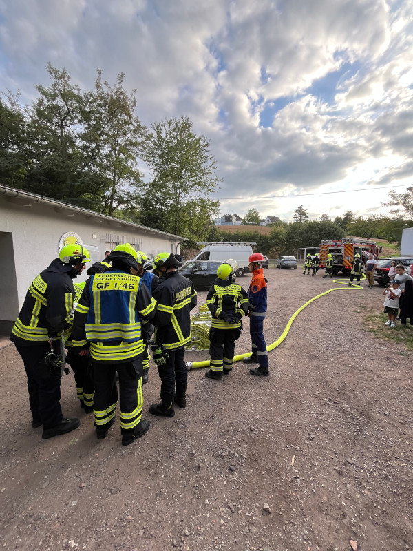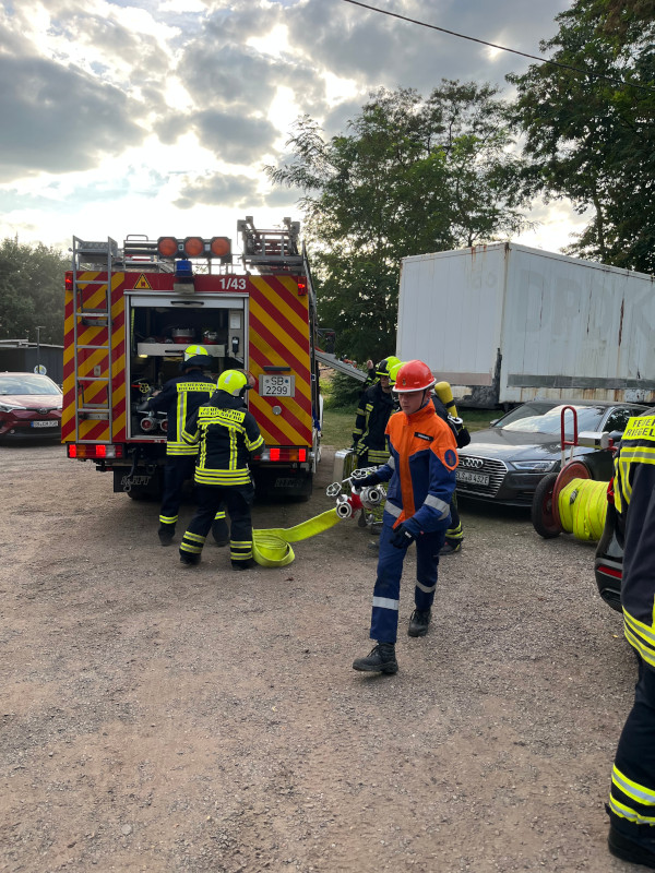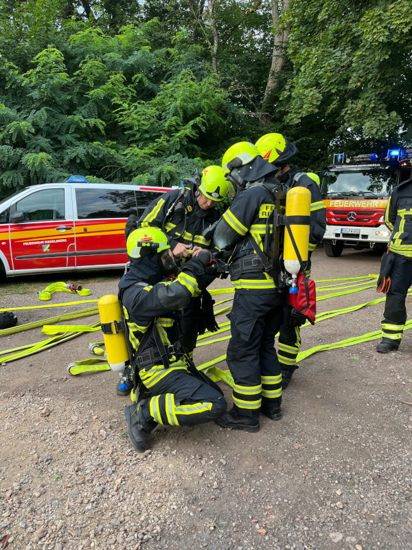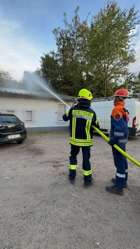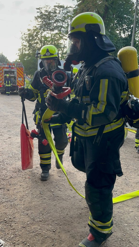Von einem aufgeregten Vereinsmitglied wird der Einsatztrupp der Feuerwehr empfangen, es würden drei Menschen vermisst, die sich noch im Innern des Gebäudes befinden. Das Gebäudeinnere ist komplett verraucht, man sieht die Hand vor Augen nicht. Mit Masken und in voller Montur betreten die Feuerwehrleute das Vereinsheim und können nach kurzer Zeit die vermissten Menschen ins Freie retten und erste Hilfe leisten.