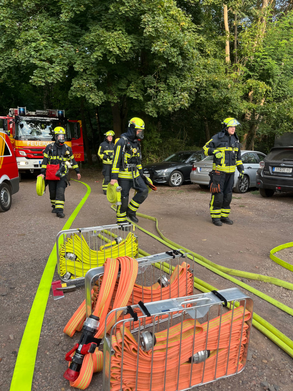 Plötzlich ruft jemand: “Es brennt!! Raus hier!” Eilig, etwas überrumpelt und verwirrt verlassen die Sportschützen das Vereinsheim. Wenig später ertönen auch schon die Sirenen der Einsatzfahrzeuge aus Richtung Lampennest und kommen über die Straße durch den Wald schnell näher.