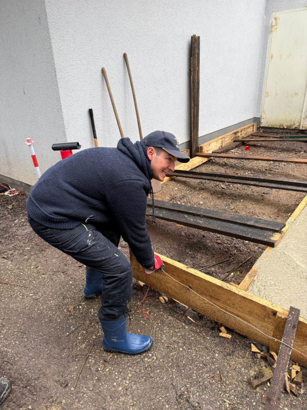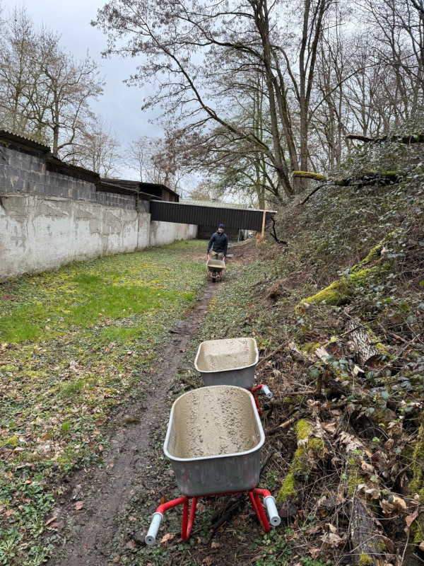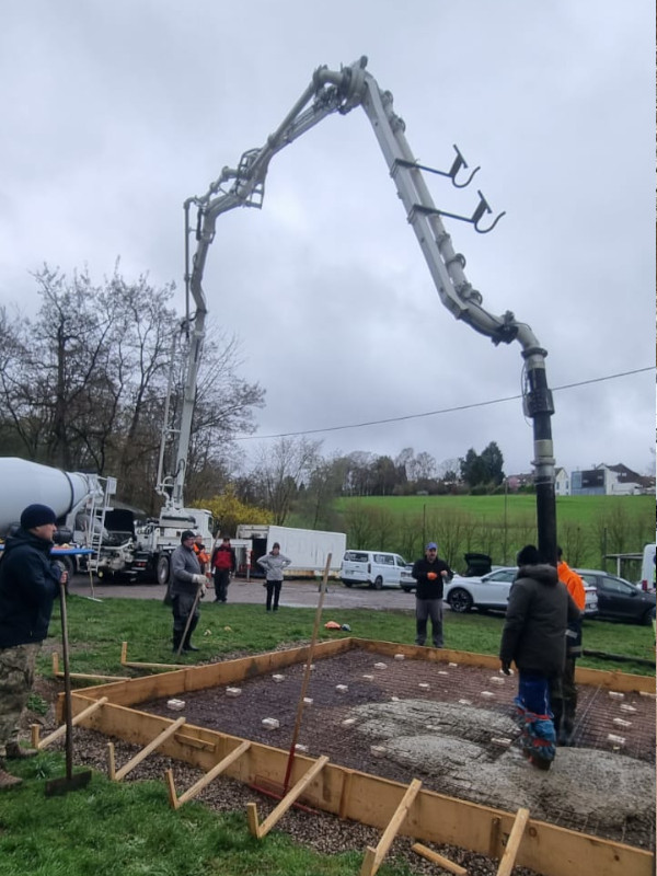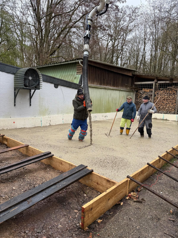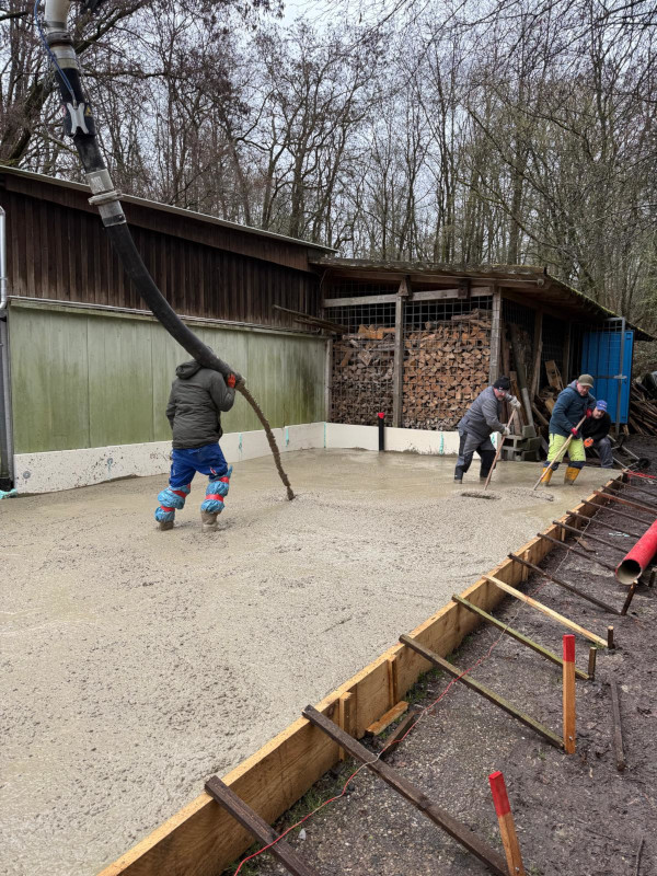 Heute, am 14. März, war es endlich soweit, der Beton sollte schon früh am Morgen geliefert werden! Schubkarren, Schaufeln und anderes Werkzeug wurden bereit gestellt und letzte Vorbereitungen getroffen.